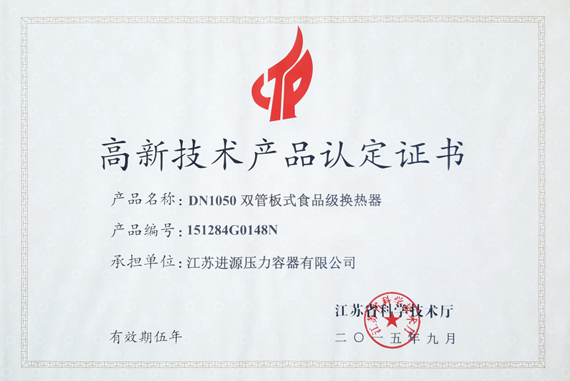 高新技術產品認定證書-雙管板式食品級換熱器