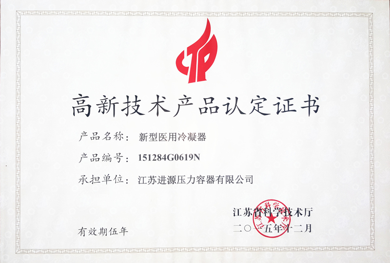 高新技術產品認定證書-新型醫用冷凝器
