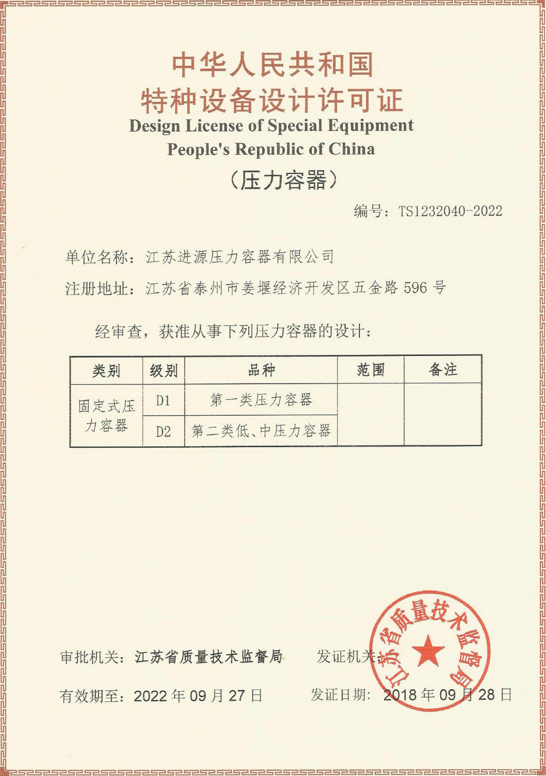 特種設備制造許可證